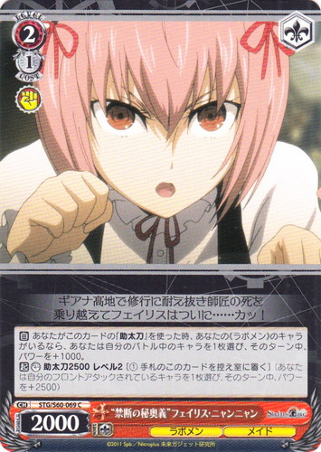 ![]() ![]() | STG/S60-056 “本名「秋葉 留未穂」” フェイリス・ニャンニャン キャラ ブースターパック STEINS;GATE R 色:赤 レベル:1 コスト:0 パワー:5000 ソウル:1 特徴:ラボメン/メイド 【自】【CXコンボ】[①]あなたのクライマックス置場に「フェイリス杯」が置かれた時、前列にこのカードがいるなら、あなたはコストを払ってよい。そうしたら、あなたは他の自分の《ラボメン》のキャラを1枚選び、「スタンド」する。 でもでも・・・今の話は内緒にしておいて欲しいニャ。 みんなも今までどおりフェイリスLOVEで接して欲しいニャ 作品名:STEINS;GATE |