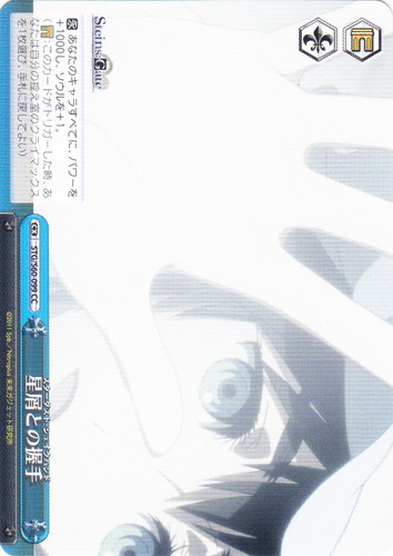 ![]() ![]() | STG/S60-099 星屑との握手 クライマックス ブースターパック STEINS;GATE CC 色:青 トリガー:ソウル/ゲート 【永】あなたのキャラすべてに、パワーを+1000し、ソウルを+1。 (【ゲート】:このカードがトリガーした時、あなたは自分の控え室のクライマックスを1枚選び、手札に戻してよい) 作品名:STEINS;GATE |