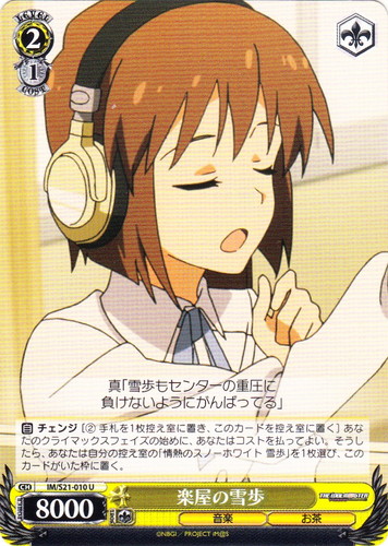 ![]() ![]() | IM/S21-010 楽屋の雪歩 キャラ ブースターパック アニメ アイドルマスター U 色:黄 レベル:2 コスト:1 パワー:8000 ソウル:1 特徴:音楽/お茶 トリガー:ソウル 【自】チェンジ[②手札を1枚控え室に置き、このカードを控え室に置く]あなたのクライマックスフェイズの始めに、あなたはコストを払ってよい。そうしたら、あなたは自分の控え室の「情熱のスノーホワイト 雪歩」を1枚選び、このカードがいた枠に置く。 真「雪歩もセンターの重圧に負けないようにがんばってる」 作品名:THE IDOLM@STER |