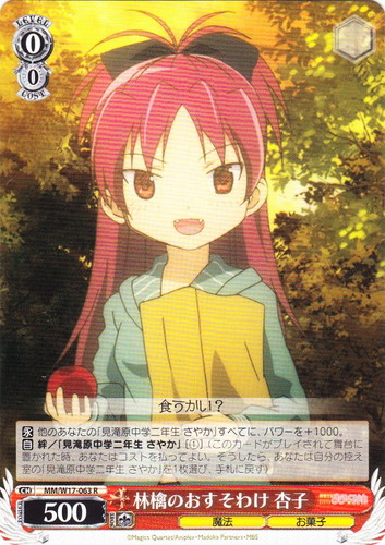 ![]() ![]() | MM/W17-063 林檎のおすそわけ 杏子 キャラ ブースターパック 魔法少女まどか☆マギカ R 色:赤 レベル:0 コスト:0 パワー:500 ソウル:1 特徴:魔法/お菓子 【永】他のあなたの「見滝原中学二年生 さやか」すべてに、パワーを+1000。 【自】絆/「見滝原中学二年生 さやか」[①](このカードがプレイされて舞台に置かれた時、あなたはコストを払ってよい。そうしたら、あなたは自分の控え室の「見滝原中学二年生 さやか」を1枚選び、手札に戻す) 食うかい? 作品名:魔法少女まどか☆マギカ |