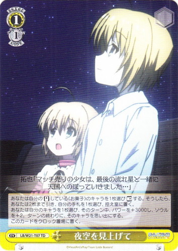 ![]() ![]() | LB/W21-T07 夜空を見上げて イベント トライアルデッキ アニメ リトルバスターズ! TD 色:黄 レベル:1 コスト:1 あなたは自分の「スタンド」している《お菓子》のキャラを1枚選び「レスト」する。そうしたら、あなたは2枚まで引き、自分の手札を1枚選び、控え室に置く。 あなたは自分のキャラを1枚選び、そのターン中、パワーを+3000し、ソウルを+2。ターンの終わりに、そのキャラを思い出にする。 このカードをクロック置場に置く。 拓也「マッチ売りの少女は、最後の流れ星と一緒に 天国にのぼっていきました・・・」 作品名:リトルバスターズ! |