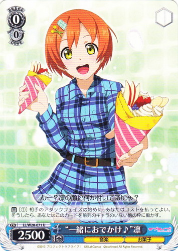 ![]() ![]() | LL/W28-071 “一緒におでかけ♪” 凛 キャラ ブースターパック ラブライブ! feat.スクールアイドルフェスティバル U 色:青 レベル:0 コスト:0 パワー:2500 ソウル:1 特徴:音楽/お菓子 【自】[①]相手のアタックフェイズの始めに、あなたはコストを払ってよい。そうしたら、あなたはこのカードを前列のキャラのいない他の枠に動かす。 んー?凛の顔に何か付いてるにゃ? 作品名:ラブライブ! School idol project |