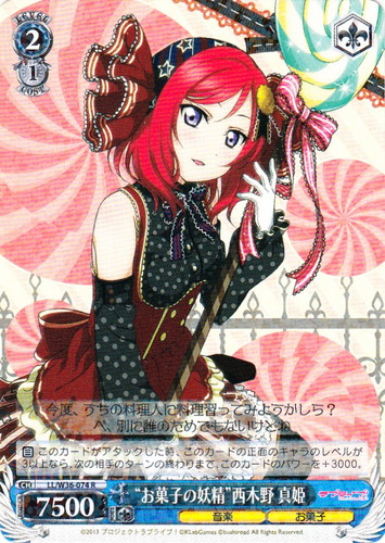 ![]() ![]() | LL/W36-006 “お菓子の妖精” 矢澤 にこ キャラ ブースターパック ラブライブ! feat.スクールアイドルフェスティバル Vol.2 R 色:緑 レベル:1 コスト:0 パワー:4500 ソウル:1 特徴:音楽/お菓子 【永】他のあなたのカード名に「にこ」を含むキャラが2枚以上なら、このカードのパワーを+1000。 【起】[あなたの《音楽》のキャラを2枚「レスト」する]あなたは自分のキャラを1枚選び、そのターン中、次の能力を与える。『【自】このカードのバトル相手が「リバース」した時、あなたは自分の山札の上から1枚を、ストック置場に置いてよい。』 にこみたいに要領がよくないと、短時間で一汁三菜の食事を作るのは難しいわね 作品名:ラブライブ! School idol project |
