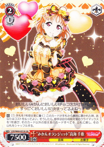![]() ![]() | LSS/W69-051A “みかんオランジェット” 高海 千歌 キャラ ブースターパック ラブライブ!サンシャイン!! feat.スクールアイドルフェスティバル~6th Anniversary~ UA 色:赤 レベル:2 コスト:1 パワー:7500 ソウル:1 特徴:音楽/お菓子 トリガー:ソウル 【自】[①手札を1枚控え室に置く]このカードが手札から舞台に置かれた時、あなたはコストを払ってよい。そうしたら、相手は自分の控え室のクライマックスを1枚選び、そのカード以外の控え室のカードすべてを、山札に戻し、その山札をシャッフルする。 おいしいみかんにおいしいチョコをかけたら、すっごくおいしいに決まってるよねっ! 作品名:ラブライブ!サンシャイン!! |