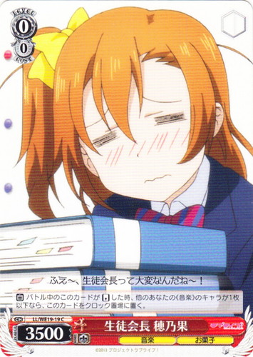 ![]() ![]() | LL/WE19-19 生徒会長 穂乃果 キャラ エクストラブースター ラブライブ! C 色:赤 レベル:0 コスト:0 パワー:3500 ソウル:1 特徴:音楽/お菓子 【自】バトル中のこのカードが「リバース」した時、他のあなたの《音楽》のキャラが1枚以下なら、このカードをクロック置場に置く。 ふえ~、生徒会長って大変なんだね~! 作品名:ラブライブ! School idol project |