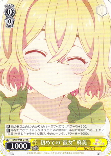 ![]() ![]() | KNK/W86-010 初めての“彼女” 麻美 キャラ ブースターパック 彼女、お借りします C 色:黄 レベル:0 コスト:0 パワー:1000 ソウル:1 特徴:かのかり 【永】他のあなたの《かのかり》のキャラすべてに、パワーを+500。 【自】あなたのクライマックスフェイズの始めに、あなたは自分のカード名に「麻美」を含むキャラを1枚選び、そのターン中、パワーを+1000。 作品名:彼女、お借りします |