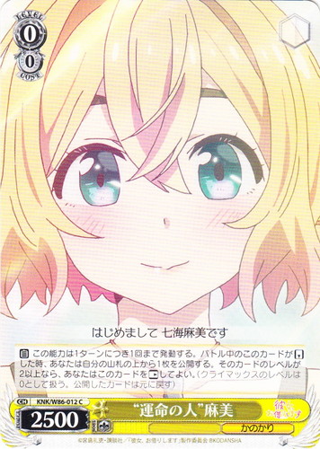 ![]() ![]() | KNK/W86-012 “運命の人” 麻美 キャラ ブースターパック 彼女、お借りします C 色:黄 レベル:0 コスト:0 パワー:2500 ソウル:1 特徴:かのかり 【自】この能力は1ターンにつき1回まで発動する。バトル中のこのカードが「リバース」した時、あなたは自分の山札の上から1枚を公開する。そのカードのレベルが2以上なら、あなたはこのカードを「レスト」してよい。(クライマックスのレベルは0として扱う。公開したカードは元に戻す) はじめまして 七海麻美です 作品名:彼女、お借りします |