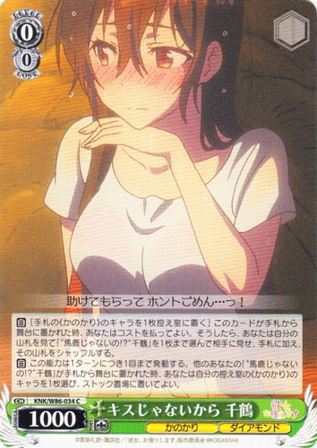 ![]() ![]() | KNK/W86-034 キスじゃないから 千鶴 キャラ ブースターパック 彼女、お借りします C 色:緑 レベル:0 コスト:0 パワー:1000 ソウル:1 特徴:かのかり/ダイアモンド 【自】[手札の《かのかり》のキャラを1枚控え室に置く]このカードが手札から舞台に置かれた時、あなたはコストを払ってよい。そうしたら、あなたは自分の山札を見て「“馬鹿じゃないの!?” 千鶴」を1枚まで選んで相手に見せ、手札に加え、その山札をシャッフルする。 【自】この能力は1ターンに1回まで発動する。他のあなたの「“馬鹿じゃないの!?” 千鶴」が手札から舞台に置かれた時、あなたは自分の控え室の《かのかり》のキャラを1枚選び、ストック置場に置いてよい。 助けてもらって ホントごめん・・・っ! 作品名:彼女、お借りします |