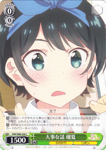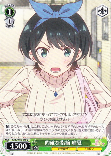 ![]() ![]() | KNK/W86-040 的確な指摘 瑠夏 キャラ ブースターパック 彼女、お借りします C 色:緑 レベル:1 コスト:1 パワー:4500 ソウル:1 特徴:かのかり/リボン トリガー:ソウル 【自】このカードが「リバース」した時、このカードのバトル相手のレベルが相手のレベルより高いなら、あなたは相手のクロックの上から1枚を、控え室に置いてよい。そうしたら、あなたはそのキャラをクロック置場に置く。 これは認めたってことでいいですか? ウソの彼氏さん! 作品名:彼女、お借りします |