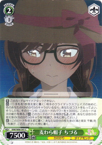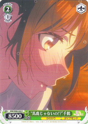 ![]() ![]() | KNK/W86-042 “馬鹿じゃないの!?” 千鶴 キャラ ブースターパック 彼女、お借りします C 色:緑 レベル:2 コスト:1 パワー:8500 ソウル:1 特徴:かのかり/ダイアモンド トリガー:ソウル 作品名:彼女、お借りします |