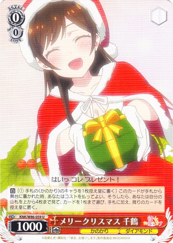 ![]() ![]() | KNK/W86-059 メリークリスマス 千鶴 キャラ ブースターパック 彼女、お借りします U 色:赤 レベル:0 コスト:0 パワー:1000 ソウル:1 特徴:かのかり/ダイアモンド 【自】[①手札の《かのかり》のキャラを1枚控え室に置く]このカードが手札から舞台に置かれた時、あなたはコストを払ってよい。そうしたら、あなたは自分の山札を上から4枚まで見て、カードを1枚まで選び、手札に加え、残りのカードを控え室に置く。 はいっ コレ プレゼント! 作品名:彼女、お借りします |
