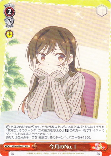 ![]() ![]() | KNK/W86-073 今月のNo.1 イベント ブースターパック 彼女、お借りします U 色:赤 レベル:2 コスト:3 【カウンター】あなたの《かのかり》のキャラが5枚以上なら、あなたはバトル中のキャラを1枚選び、そのターン中、次の能力を与える。『【永】このカードはプレイヤーにダメージを与えることができない。』 あなたは自分のキャラを1枚選び、そのターン中、パワーを+1500。 作品名:彼女、お借りします |