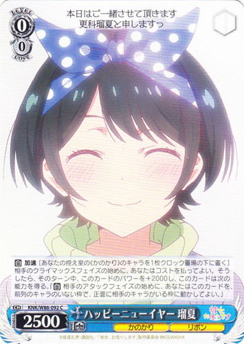 ![]() ![]() | KNK/W86-093 “そんなの耐えられませんっ!!” 瑠夏 キャラ ブースターパック 彼女、お借りします C 色:青 レベル:0 コスト:0 パワー:3000 ソウル:1 特徴:かのかり/リボン おばあさんの前では千鶴さんが“彼女”で私はただのお友達だなんて 作品名:彼女、お借りします |