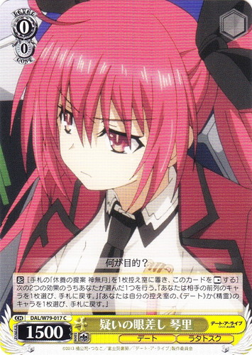 ![]() ![]() | DAL/W79-017 疑いの眼差し 琴里 キャラ ブースターパック デート・ア・ライブ C 色:黄 レベル:0 コスト:0 パワー:1500 ソウル:1 特徴:デート/ラタトスク 【起】[手札の「休養の提案 神無月」を1枚控え室に置き、このカードを「レスト」する]次の2つの効果のうちあなたが選んだ1つを行う。『あなたは相手の前列のキャラを1枚選び、手札に戻す。』『あなたは自分の控え室の、《デート》か《精霊》のキャラを1枚選び、手札に戻す。』 何が目的? 作品名:デート・ア・ライブ |
