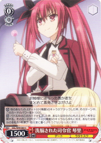 ![]() ![]() | DAL/W99-065 洗脳された司令官 琴里 キャラ ブースターパック デート・ア・ライブ Vol.2 C 色:赤 レベル:0 コスト:0 パワー:1500 ソウル:1 特徴:デート/ラタトスク 【自】他のあなたの、《デート》か《精霊》のキャラがアタックした時、そのターン中、このカードのパワーを+1000。 【自】バトル中のこのカードが「リバース」した時、あなたは自分の山札の上から1枚を公開する。そのカードが《デート》か《精霊》のキャラなら手札に加え、あなたは自分の手札を1枚選び、控え室に置く。(そうでないなら元に戻す) お姉様に逆らった愚か者を まとめて蒸発させるだけよ 作品名:デート・ア・ライブII |