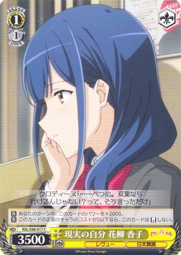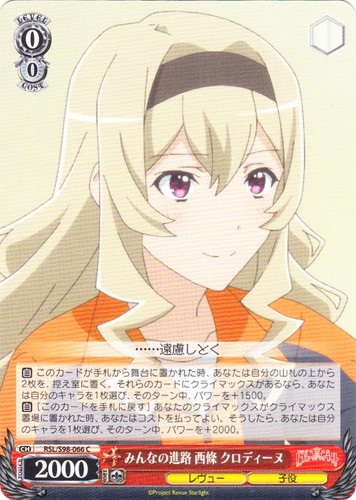![]() ![]() | RSL/S98-067 盤上での腕前 西條 クロディーヌ キャラ ブースターパック 劇場版 少女☆歌劇 レヴュースタァライト C 色:赤 レベル:0 コスト:0 パワー:2000 ソウル:1 特徴:レヴュー/武器 【自】[手札の、「気高き意志 西條 クロディーヌ」か「壮烈な覚悟 天堂 真矢」を1枚控え室に置く]このカードが手札から舞台に置かれた時、あなたはコストを払ってよい。そうしたら、あなたは自分の山札を上から5枚まで見て、《レヴュー》のキャラを1枚まで選んで相手に見せ、手札に加え、残りのカードを控え室に置き、そのターン中、このカードのパワーを+1000。 ・・・・・・あんた、弱すぎじゃない? 作品名:劇場版 少女☆歌劇 レヴュースタァライト |