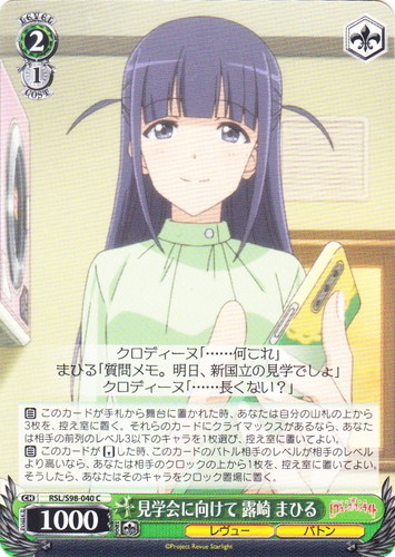 ![]() ![]() | RSL/S98-040 見学会に向けて 露崎 まひる キャラ ブースターパック 劇場版 少女☆歌劇 レヴュースタァライト C 色:緑 レベル:2 コスト:1 パワー:1000 ソウル:1 特徴:レヴュー/バトン トリガー:ソウル 【自】このカードが手札から舞台に置かれた時、あなたは自分の山札の上から3枚を、控え室に置く。それらのカードにクライマックスがあるなら、あなたは相手の前列のレベル3以下のキャラを1枚選び、控え室に置いてよい。 【自】このカードが「リバース」した時、このカードのバトル相手のレベルが相手のレベルより高いなら、あなたは相手のクロックの上から1枚を、控え室に置いてよい。そうしたら、あなたはそのキャラをクロック置場に置く。 クロディーヌ「・・・・・・何これ」 まひる「質問メモ。明日、新国立の見学でしょ」 クロディーヌ「・・・・・・長くない?」 作品名:劇場版 少女☆歌劇 レヴュースタァライト |