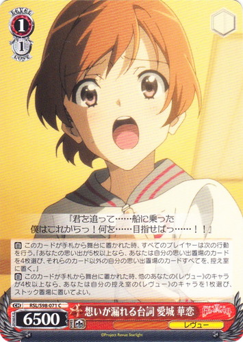 ![]() ![]() | RSL/S98-071 想いが漏れる台詞 愛城 華恋 キャラ ブースターパック 劇場版 少女☆歌劇 レヴュースタァライト C 色:赤 レベル:1 コスト:1 パワー:6500 ソウル:1 特徴:レヴュー 【自】このカードが手札から舞台に置かれた時、すべてのプレイヤーは次の行動を行う。『あなたの思い出が5枚以上なら、あなたは自分の思い出置場のカードを4枚選び、それらのカード以外の自分の思い出置場のカードすべてを、控え室に置く。』 【自】このカードが手札から舞台に置かれた時、他のあなたの《レヴュー》のキャラが4枚以上なら、あなたは自分の控え室の《レヴュー》のキャラを1枚選び、ストック置場に置いてよい。 『君を追って・・・・・・船に乗った 僕はこれからっ!何を・・・・・・目指せばっ・・・・・・!!』 作品名:劇場版 少女☆歌劇 レヴュースタァライト |