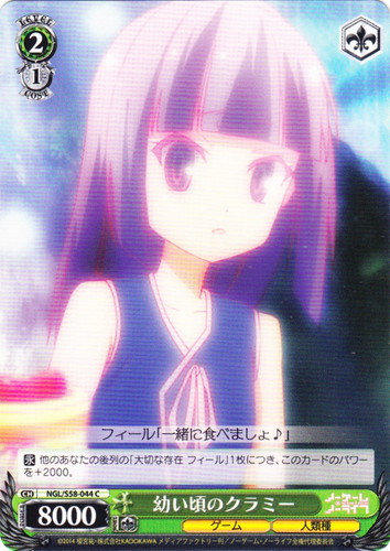 ![]() ![]() | NGL/S58-044 幼い頃のクラミー キャラ ブースターパック ノーゲーム・ノーライフ C 色:緑 レベル:2 コスト:1 パワー:8000 ソウル:1 特徴:ゲーム/人類種 トリガー:ソウル 【永】他のあなたの後列の「大切な存在 フィール」1枚につき、このカードのパワーを+2000。 フィール「一緒に食べましょ♪」 作品名:ノーゲーム・ノーライフ |