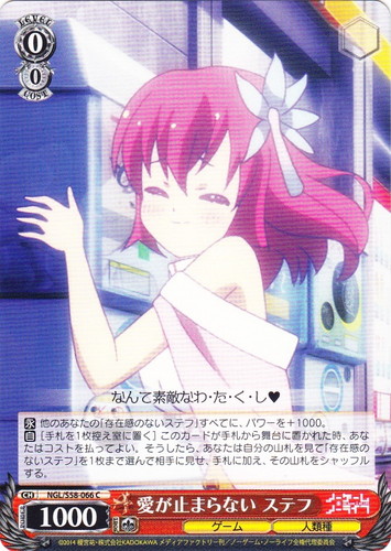 ![]() ![]() | NGL/S58-066 愛が止まらない ステフ キャラ ブースターパック ノーゲーム・ノーライフ C 色:赤 レベル:0 コスト:0 パワー:1000 ソウル:1 特徴:ゲーム/人類種 【永】他のあなたの「存在感のないステフ」すべてに、パワーを+1000。 【自】[手札を1枚控え室に置く]このカードが手札から舞台に置かれた時、あなたはコストを払ってよい。そうしたら、あなたは自分の山札を見て「存在感のないステフ」を1枚まで選んで相手に見せ、手札に加え、その山札をシャッフルする。 なんて素敵なわ・た・く・し♥ 作品名:ノーゲーム・ノーライフ |