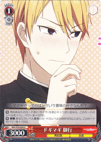 ![]() ![]() | KGL/S79-059 ドギマギ 御行 キャラ ブースターパック かぐや様は告らせたい~天才たちの恋愛頭脳戦~ U 色:赤 レベル:1 コスト:0 パワー:3000 ソウル:1 特徴:秀知院/会長 【永】他のあなたのカード名に「かぐや」を含むキャラがいるなら、このカードのレベルを+1し、パワーを+2500。 【永】経験 あなたのレベル置場のカードのレベルの合計が2以上なら、このカードのパワーを+1000。 その好きってのはどういう意味の好きなんだ? 作品名:かぐや様は告らせたい~天才たちの恋愛頭脳戦~ |