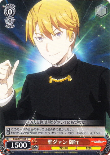 ![]() ![]() | KGL/S79-033 現代が生んだ歪み 御行 キャラ ブースターパック かぐや様は告らせたい~天才たちの恋愛頭脳戦~ U 色:緑 レベル:1 コスト:0 パワー:2000 ソウル:1 特徴:秀知院/会長 【自】【CXコンボ】[手札の、「会長のプライド」か「[[name:もっと上手に・・・」を1枚控え室に置く]このカードが手札から舞台に置かれた時、あなたはコストを払ってよい。そうしたら、あなたは自分の控え室の、「会長のプライド」か「もっと上手に・・・」を1枚選び、手札に戻す。 【自】このカードが「リバース」した時、このカードのバトル相手のコストが0以下なら、あなたは相手のクロックの上から1枚を、控え室に置いてよい。そうしたら、あなたはそのキャラをクロック置場に置く。 ―そうこの男こそ底なしの自信と無垢な貞操を兼ね備える現代が生んだ歪み、モンスター童貞なのである!― 作品名:かぐや様は告らせたい~天才たちの恋愛頭脳戦~ |