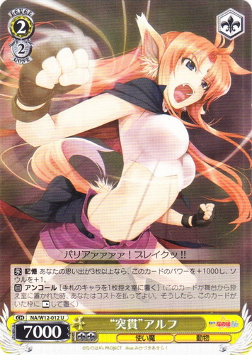 ![]() ![]() | NA/W12-012 “突貫” アルフ キャラ ブースターパック 魔法少女リリカルなのはA’s U 色:黄 レベル:2 コスト:2 パワー:7000 ソウル:2 特徴:使い魔/動物 トリガー:ソウル 【永】記憶 あなたの思い出が3枚以上なら、このカードのパワーを+1000し、ソウルを+1。 【自】アンコール[手札のキャラを1枚控え室に置く](このカードが舞台から控え室に置かれた時、あなたはコストを払ってよい。そうしたら、このカードがいた枠に「レスト」して置く) バリアァァァァ!ブレイクッ!! 作品名:魔法少女リリカルなのはA’s illust:みかづきあきら! |