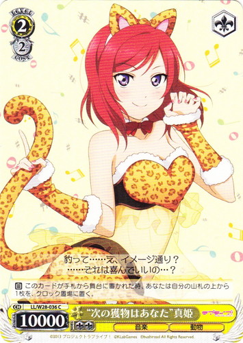 ![]() ![]() | LL/W28-036 “次の獲物はあなた” 真姫 キャラ ブースターパック ラブライブ! feat.スクールアイドルフェスティバル C 色:黄 レベル:2 コスト:2 パワー:10000 ソウル:2 特徴:音楽/動物 トリガー:ソウル 【自】このカードが手札から舞台に置かれた時、あなたは自分の山札の上から1枚を、クロック置場に置く。 豹って・・・・・・え、イメージ通り? ・・・・・・それは喜んでいいの・・・? 作品名:ラブライブ! School idol project |