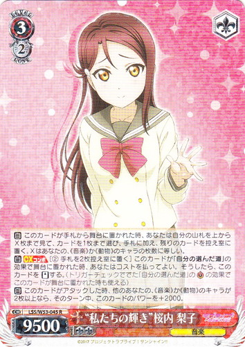 ![]() ![]() | LSS/W53-045 “私たちの輝き” 桜内 梨子 キャラ ブースターパック ラブライブ!サンシャイン!! Vol.2 R 色:赤 レベル:3 コスト:2 パワー:9500 ソウル:2 特徴:音楽 トリガー:ソウル 【自】このカードが手札から舞台に置かれた時、あなたは自分の山札を上からX枚まで見て、カードを1枚まで選び、手札に加え、残りのカードを控え室に置く。Xはあなたの、《音楽》か《動物》のキャラの枚数に等しい。 【自】【CXコンボ】[②手札を2枚控え室に置く]このカードが「自分の選んだ道」の効果で舞台に置かれた時、あなたはコストを払ってよい。そうしたら、このカードを「スタンド」する。(トリガーチェックででた「自分の選んだ道」の「スタンバイ」の効果でこのカードが舞台にこのカードが舞台に置かれた時も使える) 【自】このカードがアタックした時、他のあなたの、《音楽》か《動物》のキャラが2枚以上なら、そのターン中、このカードのパワーを+2000。 作品名:ラブライブ!サンシャイン!! |