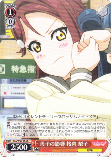 ![]() ![]() | LSS/W53-055 善子の影響 桜内 梨子 キャラ ブースターパック ラブライブ!サンシャイン!! Vol.2 C 色:赤 レベル:1 コスト:0 パワー:2500 ソウル:1 特徴:音楽 【自】このカードが手札から舞台に置かれた時、あなたは自分の山札の上から1枚を公開する。そのカードが《音楽》か《動物》のキャラなら、あなたは相手のコスト0以下のキャラを2枚まで選ぶ。それらのキャラは次の相手のスタンドフェイズに「スタンド」しない。(公開したカードは元に戻す) 梨子「サイレントチェリーブロッサムナイトメア」 作品名:ラブライブ!サンシャイン!! |