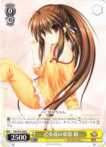 ![]() ![]() | Klb/W78-028 乙女達の安息 鈴 キャラ ブースターパック Key 20th Anniversary C 色:黄 レベル:0 コスト:0 パワー:2500 ソウル:1 特徴:Anniversary/動物 【自】[①]アンコールステップの始めに、他のあなたの前列の「レスト」しているキャラがいないなら、あなたはコストを払ってよい。そうしたら、このカードを「レスト」する。 ・・・こまりちゃん 作品名:リトルバスターズ! |