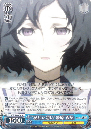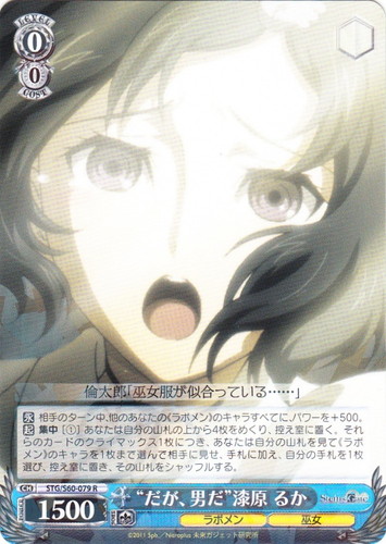 ![]() ![]() | STG/S60-078 “秘めた想い” 漆原 るか キャラ ブースターパック STEINS;GATE R 色:青 レベル:0 コスト:0 パワー:1500 ソウル:1 特徴:ラボメン/巫女 【自】このカードが手札から舞台に置かれた時、あなたは自分の山札を上から1枚見て、山札の上か下に置く。 【自】[このカードを手札に戻す]あなたのクライマックスがクライマックス置場に置かれた時、あなたはコストを払ってよい。そうしたら、あなたは自分のキャラを1枚選び、次の相手のターンの終わりまで、パワーを+1000。 あの時、岡部さんが言ってくれた言葉がすごく嬉しかったんです。あの言葉があったから岡部さんのこと好きになったんです・・・ 作品名:STEINS;GATE |