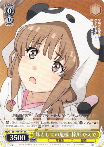 ![]() ![]() | SBY/W64-018 妹としての危機 梓川 かえで キャラ ブースターパック 青春ブタ野郎はバニーガール先輩の夢を見ない C 色:黄 レベル:0 コスト:0 パワー:3500 ソウル:1 特徴:思春期/動物 【自】バトル中のこのカードが「リバース」した時、そのターン中、あなたは『【自】アンコール』を使えない。(ルールによる『【自】アンコール[③]』も使えない) いま、かえではかえで史上最大のピンチなんです! 作品名:青春ブタ野郎はバニーガール先輩の夢を見ない |