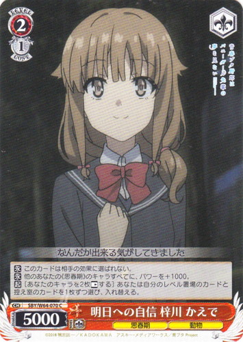 ![]() ![]() | SBY/W64-070 明日への自信 梓川 かえで キャラ ブースターパック 青春ブタ野郎はバニーガール先輩の夢を見ない C 色:赤 レベル:2 コスト:1 パワー:5000 ソウル:1 特徴:思春期/動物 トリガー:ソウル 【永】このカードは相手の効果に選ばれない。 【永】他のあなたの《思春期》のキャラすべてに、パワーを+1000。 【起】[あなたのキャラを2枚「レスト」する]あなたは自分のレベル置場のカードと控え室のカードを1枚ずつ選び、入れ替える。 なんだか出来る気がしてきました 作品名:青春ブタ野郎はバニーガール先輩の夢を見ない |