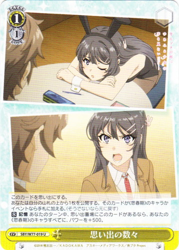 ![]() ![]() | SBY/W77-019 思い出の数々 イベント ブースターパック 青春ブタ野郎はゆめみる少女の夢を見ない U 色:黄 レベル:1 コスト:1 このカードを思い出にする。 あなたは自分の山札の上から1枚を公開する。そのカードが《思春期》のキャラかイベントなら手札に加える。(そうでないなら元に戻す) 【永】記憶 あなたのターン中、思い出置場にこのカードがあるなら、あなたの《思春期》のキャラすべてに、パワーを+500。 作品名:青春ブタ野郎はゆめみる少女の夢を見ない |