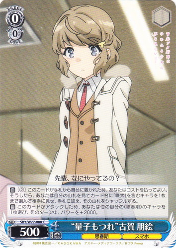 ![]() ![]() | SBY/W77-088 “量子もつれ” 古賀 朋絵 キャラ ブースターパック 青春ブタ野郎はゆめみる少女の夢を見ない C 色:青 レベル:0 コスト:0 パワー:500 ソウル:1 特徴:思春期/スマホ 【自】[②]このカードが手札から舞台に置かれた時、あなたはコストを払ってよい。そうしたら、あなたは自分の山札を見てカード名に「咲太」を含むキャラを1枚まで選んで相手に見せ、手札に加え、その山札をシャッフルする。 【自】このカードがアタックした時、あなたは他の自分の《思春期》のキャラを1枚選び、そのターン中、パワーを+2000。 先輩、なにやってるの? 作品名:青春ブタ野郎はゆめみる少女の夢を見ない |