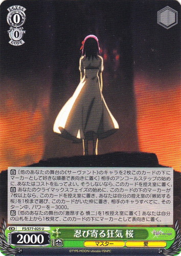 ![]() ![]() | FS/S77-025 忍び寄る狂気 桜 キャラ ブースターパック 劇場版 Fate/stay night [Heaven’s Feel] Vol.2 U 色:緑 レベル:0 コスト:0 パワー:2000 ソウル:1 特徴:マスター/愛 【自】[他のあなたの舞台の《サーヴァント》のキャラを2枚このカードの下にマーカーとして好きな順番で表向きに置く]相手のアンコールステップの始めに、あなたはコストを払ってよい。そうしないなら、このカードを控え室に置く。 【自】あなたのクライマックスフェイズの始めに、このカードの下のマーカーが7枚以上なら、このカードを控え室に置き、あなたは自分の控え室の「嫉妬する 桜」を1枚まで選び、このカードがいた枠に置き、相手のキャラすべてに、そのターン中、パワーを-3000。 【起】[他のあなたの舞台の「激昂する 慎二」を1枚控え室に置く]あなたは自分の山札を上から1枚見て、このカードの下にマーカーとして表向きに置く。 作品名:劇場版 Fate/stay night [Heaven’s Feel] |
