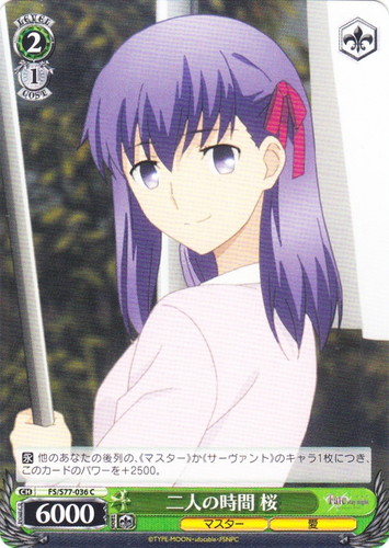 ![]() ![]() | FS/S77-036 二人の時間 桜 キャラ ブースターパック 劇場版 Fate/stay night [Heaven’s Feel] Vol.2 C 色:緑 レベル:2 コスト:1 パワー:6000 ソウル:1 特徴:マスター/愛 トリガー:ソウル 【永】他のあなたの後列の、《マスター》か《サーヴァント》のキャラ1枚につき、このカードのパワーを+2500。 作品名:劇場版 Fate/stay night [Heaven’s Feel] |