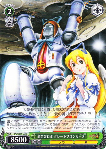 ![]() ![]() | DG/SE08-22 超合金ロボ グレートフロンガーX キャラ エクストラブースター 魔界戦記ディスガイア4 C 色:緑 レベル:2 コスト:2 パワー:8500 ソウル:2 特徴:メカ/愛 トリガー:ソウル 【自】このカードが手札から舞台に置かれた時、あなたの山札が5枚以下なら、あなたは自分の控え室のカードすべてを山札に戻す。そうしたら、その山札をシャッフルし、次の相手のターンの終わりまで、このカードのパワーを+3000。 天使長フロン「青い地球を守るため!時空を超えてやってきた!愛の祈りが呼ぶチカラ!!」 作品名:魔界戦記ディスガイア4 |