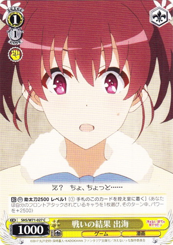 ![]() ![]() | SHS/W71-014 徹底的なこだわり 英梨々 キャラ ブースターパック 冴えない彼女の育てかた♭ U 色:黄 レベル:0 コスト:0 パワー:2000 ソウル:1 特徴:ゲーム/漫画 【自】このカードが手札から舞台に置かれた時、あなたは自分の山札の上から1枚を公開する。そのカードのレベルが1以上なら、そのターン中、このカードのパワーを+2000。(クライマックスのレベル0として扱う。公開したカードは元に戻す) 【自】このカードのバトル相手が「リバース」した時、あなたは他の自分の《ゲーム》のキャラを1枚選び、「レスト」し、後列のキャラのいない枠に動かす。 あんたが全員水着にしなくちゃ嫌だって言うからこうして付き合ってるのよ? 作品名:冴えない彼女の育てかた♭ |