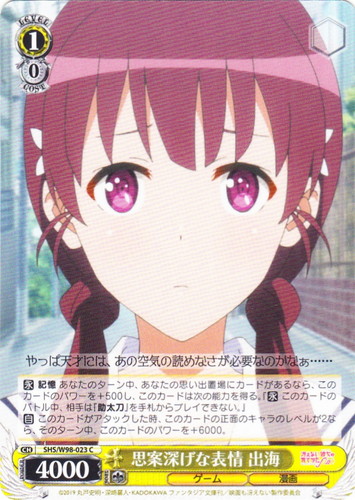 ![]() ![]() | SHS/W98-023 思案深げな表情 出海 キャラ ブースターパック 冴えない彼女の育てかた Fine C 色:黄 レベル:1 コスト:0 パワー:4000 ソウル:1 特徴:ゲーム/漫画 【永】記憶 あなたのターン中、あなたの思い出置場にカードがあるなら、このカードのパワーを+500し、このカードは次の能力を得る。『【永】このカードのバトル中、相手は「助太刀」を手札からプレイできない。』 【自】このカードがアタックした時、このカードの正面のキャラのレベルが2なら、そのターン中、このカードのパワーを+6000。 やっぱ天才には、あの空気の読めなさが必要なのかなぁ・・・・・・ 作品名:冴えない彼女の育てかた Fine |