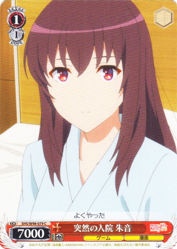 ![]() ![]() | SHS/W98-079 突然の入院 朱音 キャラ ブースターパック 冴えない彼女の育てかた Fine C 色:赤 レベル:1 コスト:1 パワー:7000 ソウル:1 特徴:ゲーム/漫画 よくやった 作品名:冴えない彼女の育てかた Fine |