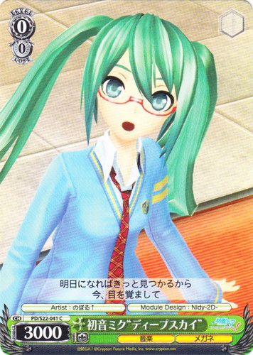 ![]() ![]() | PD/SE32-P02 ハジメテノオト イベント プロモーションカード 初音ミク -Project DIVA- X HD PR 色:緑 レベル:2 コスト:1 【カウンター】あなたは自分の《音楽》のキャラを1枚選び、そのターン中、パワーを+X。Xはあなたの控え室の異なるカード名のクライマックスの枚数×1000に等しい。異なるカード名のクライマックスが6枚以上なら、あなたは自分のクロックを1枚選び、控え室に置いてよい。 空の色も 風のにおいも 海の深さも あなたの声も ワタシは知らない だけど歌を 歌をうたう ただ声をあげて 作品名:初音ミク -Project DIVA- X HD illust:bob Artist:melo |
