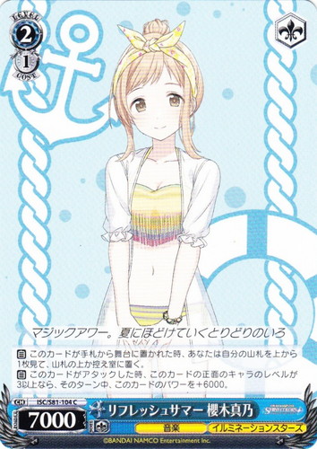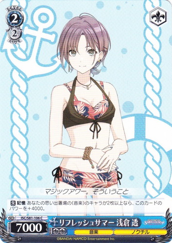 ![]() ![]() | ISC/S81-104 リフレッシュサマー 櫻木真乃 キャラ ブースターパック アイドルマスター シャイニーカラーズ C 色:青 レベル:2 コスト:1 パワー:7000 ソウル:1 特徴:音楽/イルミネーションスターズ トリガー:ソウル 【自】このカードが手札から舞台に置かれた時、あなたは自分の山札を上から1枚見て、山札の上か控え室に置く。 【自】このカードがアタックした時、このカードの正面のキャラのレベルが3以上なら、そのターン中、このカードのパワーを+6000。 マジックアワー。夏にほどけていくとりどりのいろ 作品名:アイドルマスター シャイニーカラーズ |