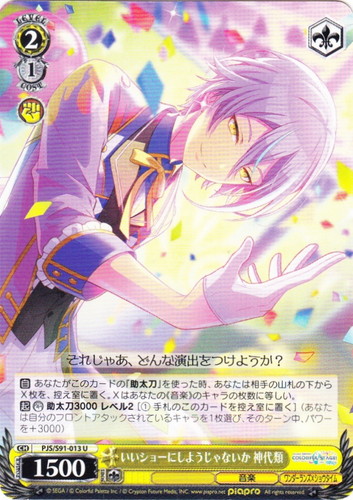 ![]() ![]() | PJS/S91-013 いいショーにしようじゃないか 神代類 キャラ ブースターパック プロジェクトセカイ カラフルステージ! feat. 初音ミク U 色:黄 レベル:2 コスト:1 パワー:1500 ソウル:1 特徴:音楽/ワンダーランズ×ショウタイム トリガー:ソウル 【自】あなたがこのカードの「助太刀」を使った時、あなたは相手の山札の下からX枚を、控え室に置く。Xはあなたの《音楽》のキャラの枚数に等しい。 【起】【カウンター】助太刀3000 レベル2[①手札のこのカードを控え室に置く](あなたは自分のフロントアタックされているキャラを1枚選び、そのターン中、パワーを+3000) それじゃあ、どんな演出をつけようか? 作品名:プロジェクトセカイ カラフルステージ! feat. 初音ミク |