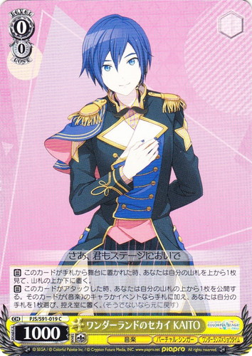 ![]() ![]() | PJS/S91-019 ワンダーランドのセカイ KAITO キャラ ブースターパック プロジェクトセカイ カラフルステージ! feat. 初音ミク C 色:黄 レベル:0 コスト:0 パワー:1000 ソウル:1 特徴:音楽/バーチャル・シンガー/ワンダーランズ×ショウタイム 【自】このカードが手札から舞台に置かれた時、あなたは自分の山札を上から1枚見て、山札の上か下に置く。 【自】このカードがアタックした時、あなたは自分の山札の上から1枚を公開する。そのカードが《音楽》のキャラかイベントなら手札に加え、あなたは自分の手札を1枚選び、控え室に置く。(そうでないなら元に戻す) さあ、君もステージにおいで 作品名:プロジェクトセカイ カラフルステージ! feat. 初音ミク |