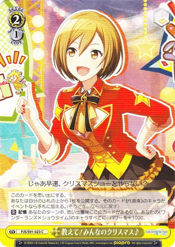 ![]() ![]() | PJS/S91-021 ハイパー★ポジティブ 鳳えむ キャラ ブースターパック プロジェクトセカイ カラフルステージ! feat. 初音ミク C 色:黄 レベル:1 コスト:0 パワー:3500 ソウル:1 特徴:音楽/ワンダーランズ×ショウタイム トリガー:ソウル 【自】[手札の《音楽》のキャラを1枚控え室に置く]このカードが手札から舞台に置かれた時、あなたはコストを払ってよい。そうしたら、あなたは控え室の、「教えて!みんなのクリスマス♪」か「ワンダー☆クリスマス!」を1枚選び、手札に戻す。 【自】この能力は1ターンにつき1回まで発動する。あなたがイベントをプレイした時、そのターン中、このカードのパワーを+2000。 うん!きっとみーんな笑顔になっちゃうよっ☆ 作品名:プロジェクトセカイ カラフルステージ! feat. 初音ミク |