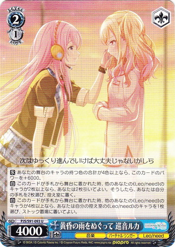 ![]() ![]() | PJS/S91-015 今も未来も 天馬咲希 キャラ ブースターパック プロジェクトセカイ カラフルステージ! feat. 初音ミク U 色:黄 レベル:2 コスト:1 パワー:6500 ソウル:1 特徴:音楽/Leo/need トリガー:ソウル 【自】このカードがアタックした時、このカードの正面のキャラのレベルが3以上なら、そのターン中、このカードのパワーを+6000。 【自】【CXコンボ】[①このカードを控え室に置く]あなたのアンコールステップの始めに、クライマックス置場に「やりたい100のこと」か「胸に残る旋律」があり、前列にこのカードがいて、他のあなたの《音楽》のキャラが2枚以上なら、あなたはコストを払ってよい。そうしたら、あなたは自分の控え室の《音楽》のキャラを1枚選び、手札に戻し、自分の手札のキャラを1枚まで選び、このカードがいた枠に置く。 演奏しようよ!みんなで! 作品名:プロジェクトセカイ カラフルステージ! feat. 初音ミク |