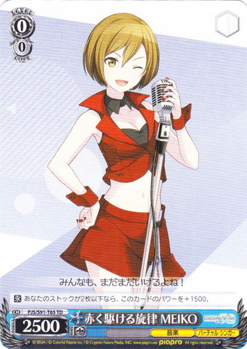 ![]() ![]() | PJS/S91-T65 赤く駆ける旋律 MEIKO キャラ トライアルデッキ+ プロジェクトセカイ カラフルステージ! feat. 初音ミク 25時、ナイトコードで。 TD 色:青 レベル:0 コスト:0 パワー:2500 ソウル:1 特徴:音楽/バーチャル・シンガー 【永】あなたのストックが2枚以下なら、このカードのパワーを+1500。 みんなも、まだまだいけるよね! 作品名:プロジェクトセカイ カラフルステージ! feat. 初音ミク |