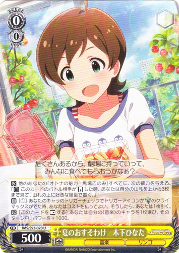 ![]() ![]() | IMS/S93-020 夏のおすそわけ 木下ひなた キャラ ブースターパック アイドルマスター ミリオンライブ! Welcome to the New St@ge U 色:黄 レベル:0 コスト:0 パワー:500 ソウル:1 特徴:音楽/リンゴ 【永】他のあなたの「オトナの魅力 馬場このみ」すべてに、次の能力を与える。『【自】このカードのバトル相手が「リバース」した時、あなたは自分の山札を上から3枚まで見て、山札の上に好きな順番で置く。』 【自】[①]あなたのキャラのトリガーチェックでトリガーアイコンが【リターン】のクライマックスがでた時、あなたはコストを払ってよい。そうしたら、あなたは1枚引く。 【起】[このカードを「レスト」する]あなたは自分の《音楽》のキャラを1枚選び、そのターン中、パワーを+1000。 たくさんあるから、劇場に持っていって、みんなに食べてもらおうかなぁ? 作品名:アイドルマスター ミリオンライブ! |